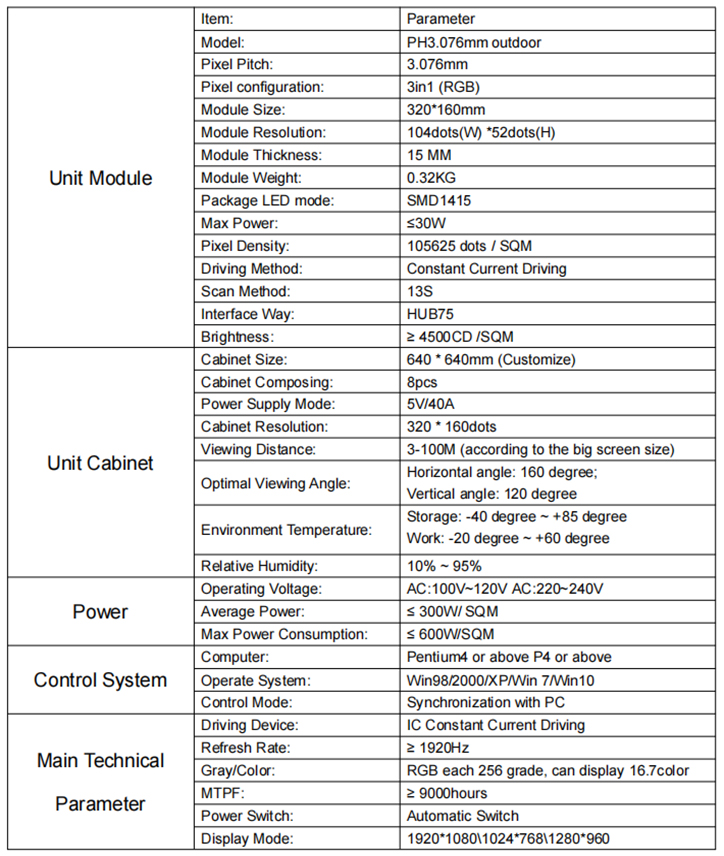PH3.076mm Outdoor LED Screen Module Parameters