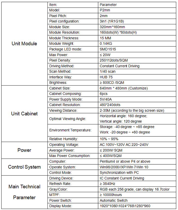 PH2.0mm Indoor LED Screen Module Parameters